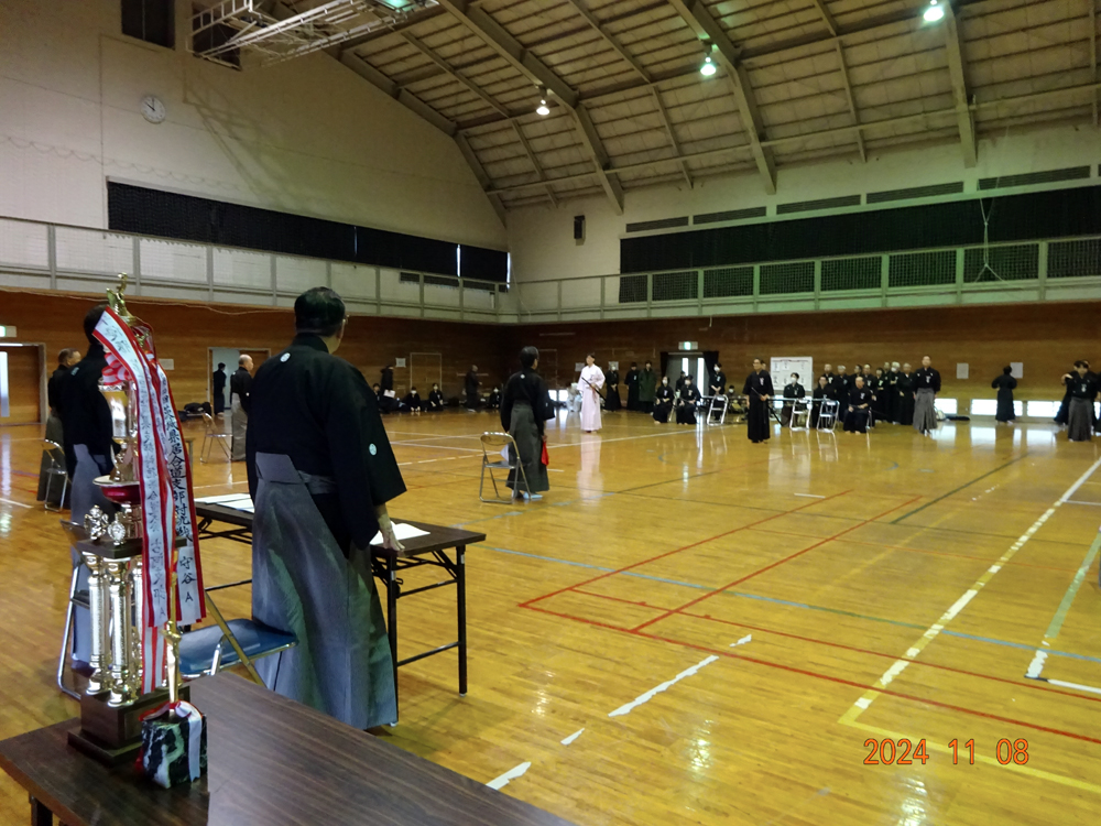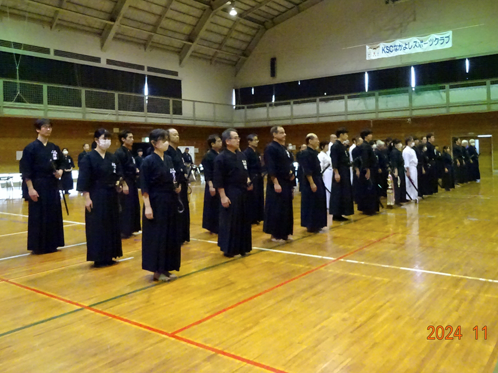 令和7年11月9日(日)わかぐり運動公園体育館にて、第5回茨城県居合道支部対抗戦並びに高段者演武大会が行われました。この日は一気に季節が進み、冷たい雨の降る肌寒い一日となりましたが、体育館の中は熱気であふれていました。四段以下の方は団体戦に参加、五段以上の方は係員、六段以上の先生方は審判と全員が一丸となって取り組んだことで素晴らしい大会となりました。